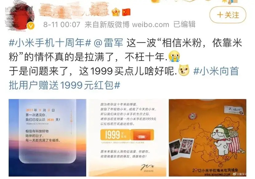 繼小米十周年發布會后,雷軍在小米新品發布會暨2021年度演講中,宣布回饋十年前第一批選擇小米1手機的18.46萬名用戶,向他們贈送與當年小米1售價相當的1999元紅包,總計約3.7億元。此舉立刻引得不少小米用戶回憶起搶購米1、參加“爆米花”同城會的情景。